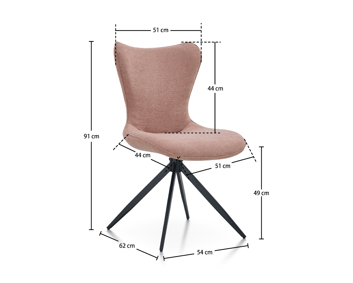 • با روکش پارچه ای صورتی نرم و مایل به قرمز ، در حالی که یک لمس پیچیدگی را به هر فضای ناهار خوری اضافه می کند ، یک تجربه صندلی دنج را ارائه می دهد. طراحی براق صندلی توسط پایه فلزی سیاه محکم آن تکمیل شده است ، که نه تنها ثبات را فراهم می کند بلکه جذابیت معاصر آن را نیز تقویت می کند.